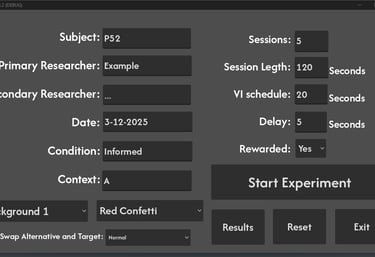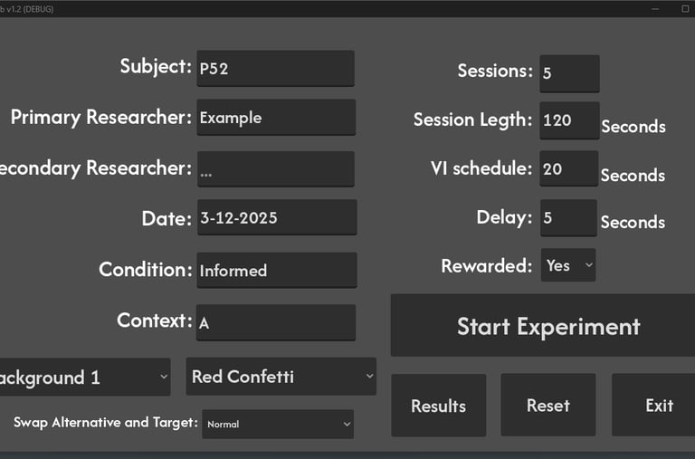 A fully customizable ABA-based experimental platform capable of implementing phase-based designs with user-defined contingencies, stimuli, and environmental parameters. The system provides real-time response logging of button presses. Eye-tracking was used alongside the task to assess attentional processes.